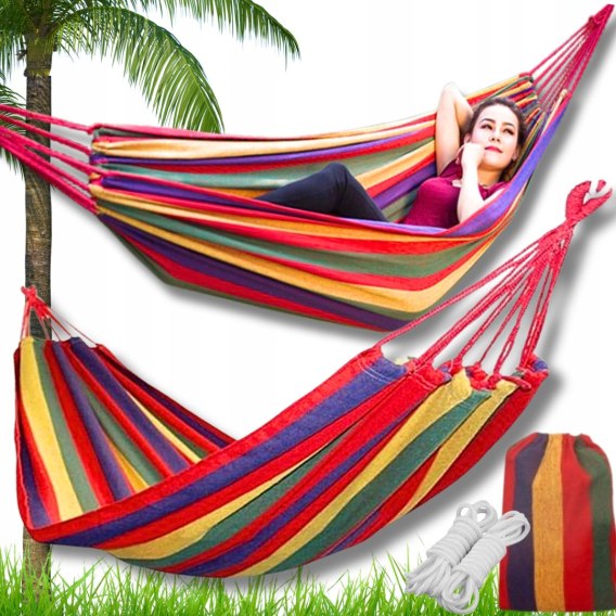 Hamak jest wykonany z wytrzymałej bawełnianej tkaniny, posiada również solidne, grubo plecione pokrowiec do przechowywania.