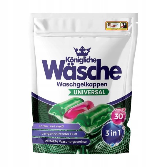 Königliche Wäsche Kapsułki do prania 3w1 Universal DE 30szt - doskonałe rozwiązanie dla szybkiego i łatwego prania. Te innowacyjne kapsułki zapewniają kompleksowe czyszczenie, ochronę tkanin i intensywny zapach.