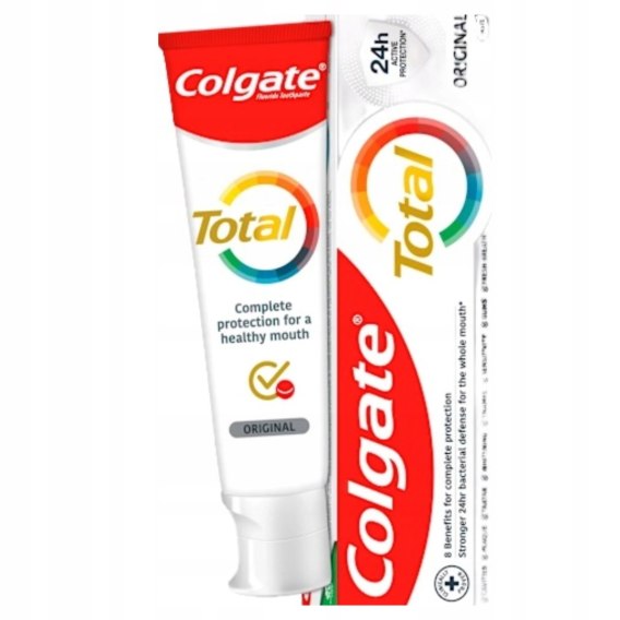 Pasta do zębów COLGATE TOTAL ORIGINAL zawiera unikalny system walczący z bakteriami, który przylega do zębów i dziąseł, dzięki czemu pomaga nawet do12 godzin non-stopwalczyć z bakteriami w jamie ustnej.
