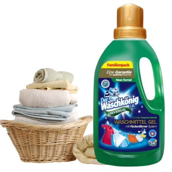 Oryginalny, niemiecki żel do prania DER WASCHKONIG C.G. Universal. Dzięki swojej gęstości oraz skoncentrowanej formule, opakowanie 1,625 g wystarcza nawet na 54 prania.